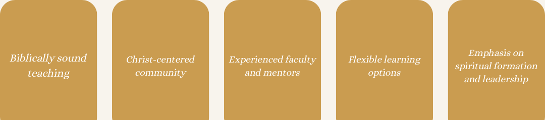 Our vision is to equip believers, emerging leaders, and ministers with biblically grounded education that supports commitments to fellowship, accountability, and partnership in advancing the gospel of Jesus Christ.